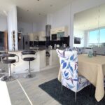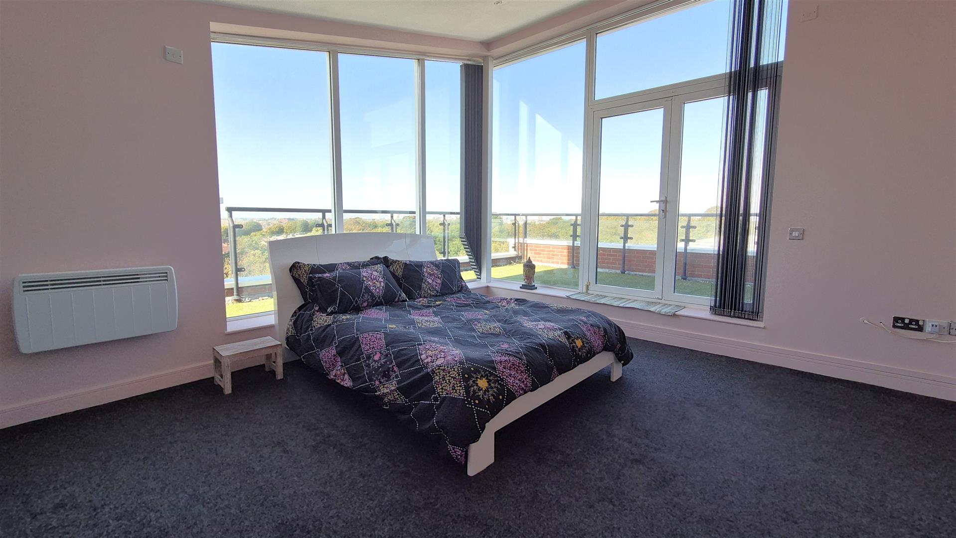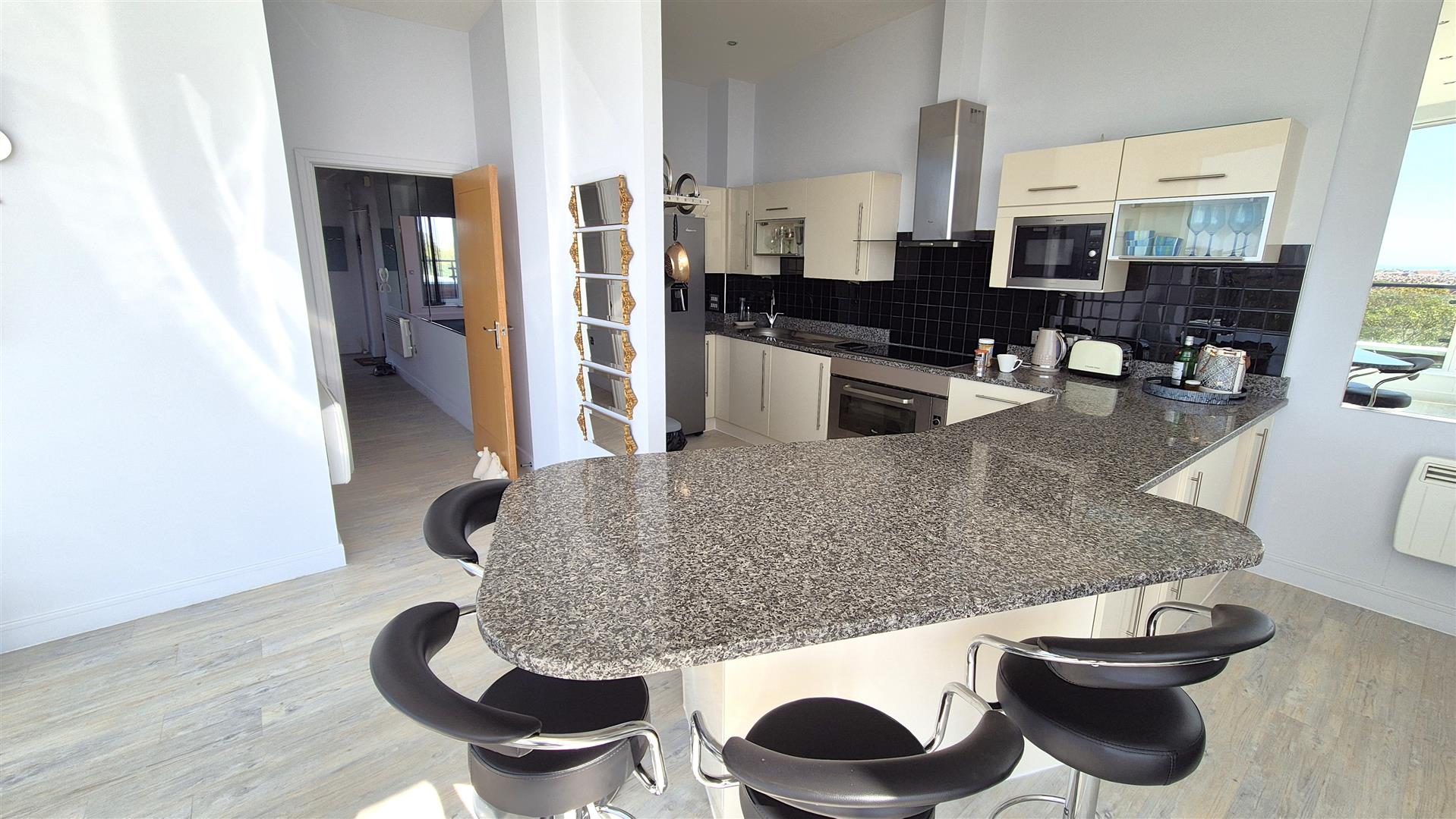 This contemporary penthouse boasts an impressive, open-plan living area with floor to ceiling windows which fill the room with natural light. A spacious kitchen/dining area is perfect for entertaining guests. The gloss creme kitchen has a large oven and hob, integrated washing machine and dishwasher along with a large American style fridge/freezer. From the lounge there is access to an open roof terrace with amazing south facing, sea views, the roof terrace extends round the whole property offering views from all angles.